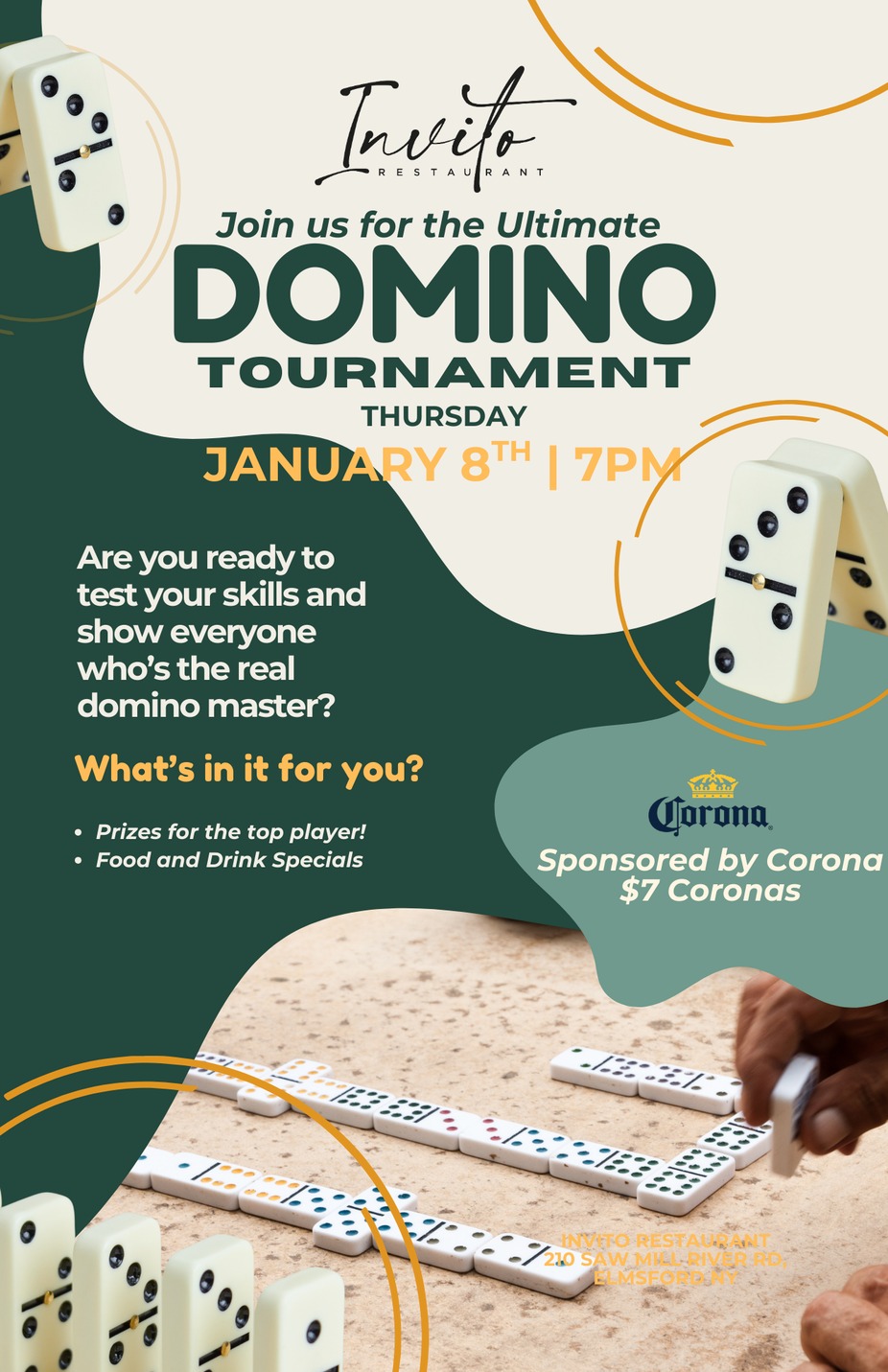 Put your skills to the test and join us for a fun-filled Domino Tournament at Invito, proudly sponsored by Corona! Event Highlights: