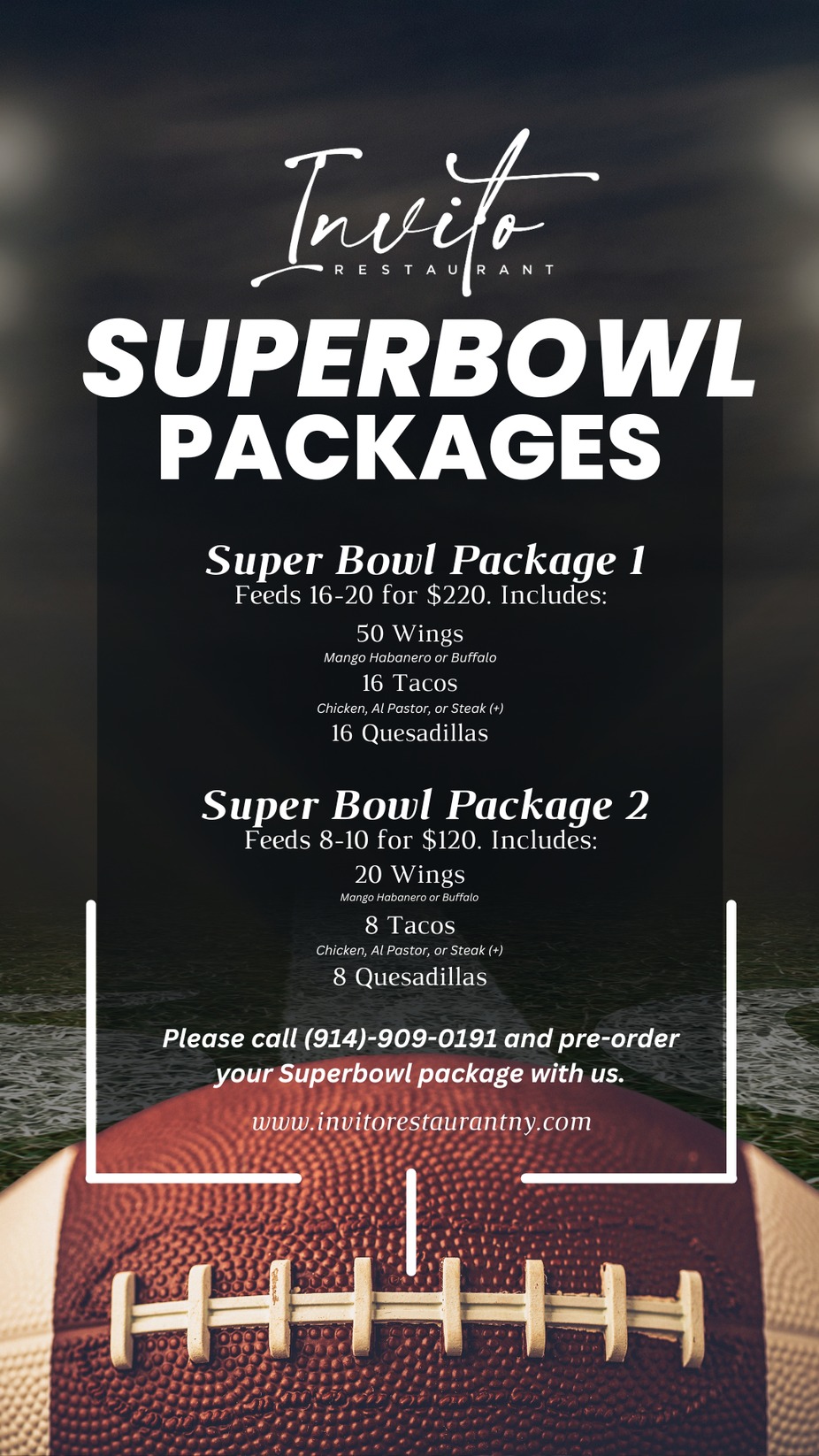 Call (914)-909-0191 to pre-order your Super Bowl package today!
